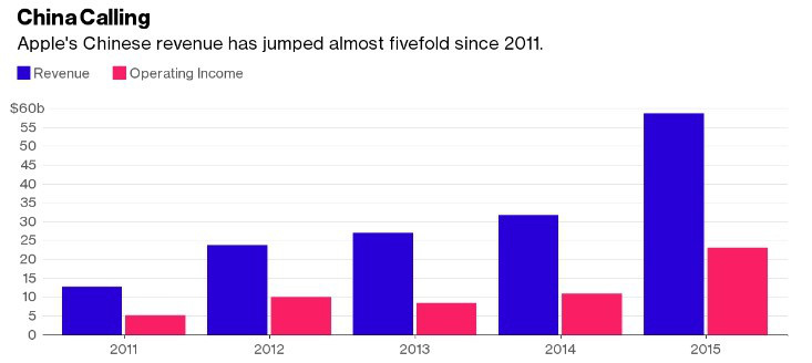 2013年至2015年,苹果中国营收了增长一倍以上至590亿美元,并实现了迅速扩张:截至3月底,苹果在中国开设了35家零售店,高于一年前的21家,将在6月底前再新开5家。苹果还在努力与中国政府保持良好关系,包括库克在5月份的访华以及同时宣布对中国最大打车服务滴滴出行投资10亿美元。